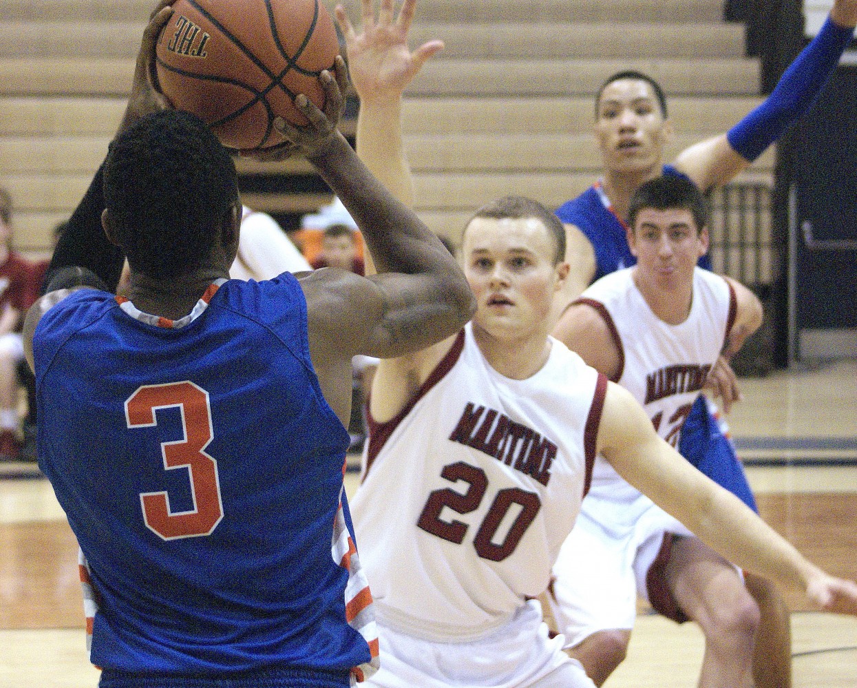 Maritime freshman Kevin Heine (#20) covers Andre Nixon (with the ball). Bobby Parlow (#12) does same with Purchase big man Joel Neri. 1-14-14 Published 01/15/2014 at 1245 × 999 in Share this:ShareTwitter
